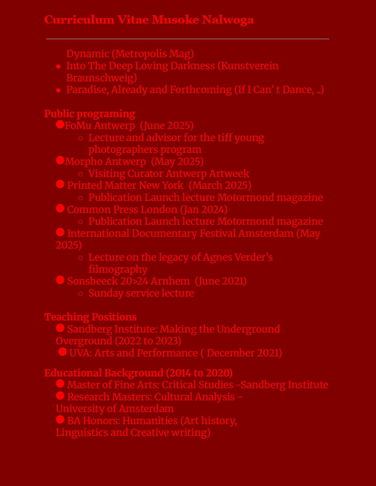 She holds a Master of Fine Arts in Critical Studies from the Sandberg Institute, a Research Master’s in Cultural Analysis from the University of Amsterdam, and a BA Honours in Humanities (Art History, Linguistics, and Creative Writing). Her public programming has featured at platforms including Printed Matter New York, FoMu Antwerp, and the International Documentary Festival Amsterdam, and she has apeared as a guest lecturer at the Sandberg Institute and the University of Amsterdam.