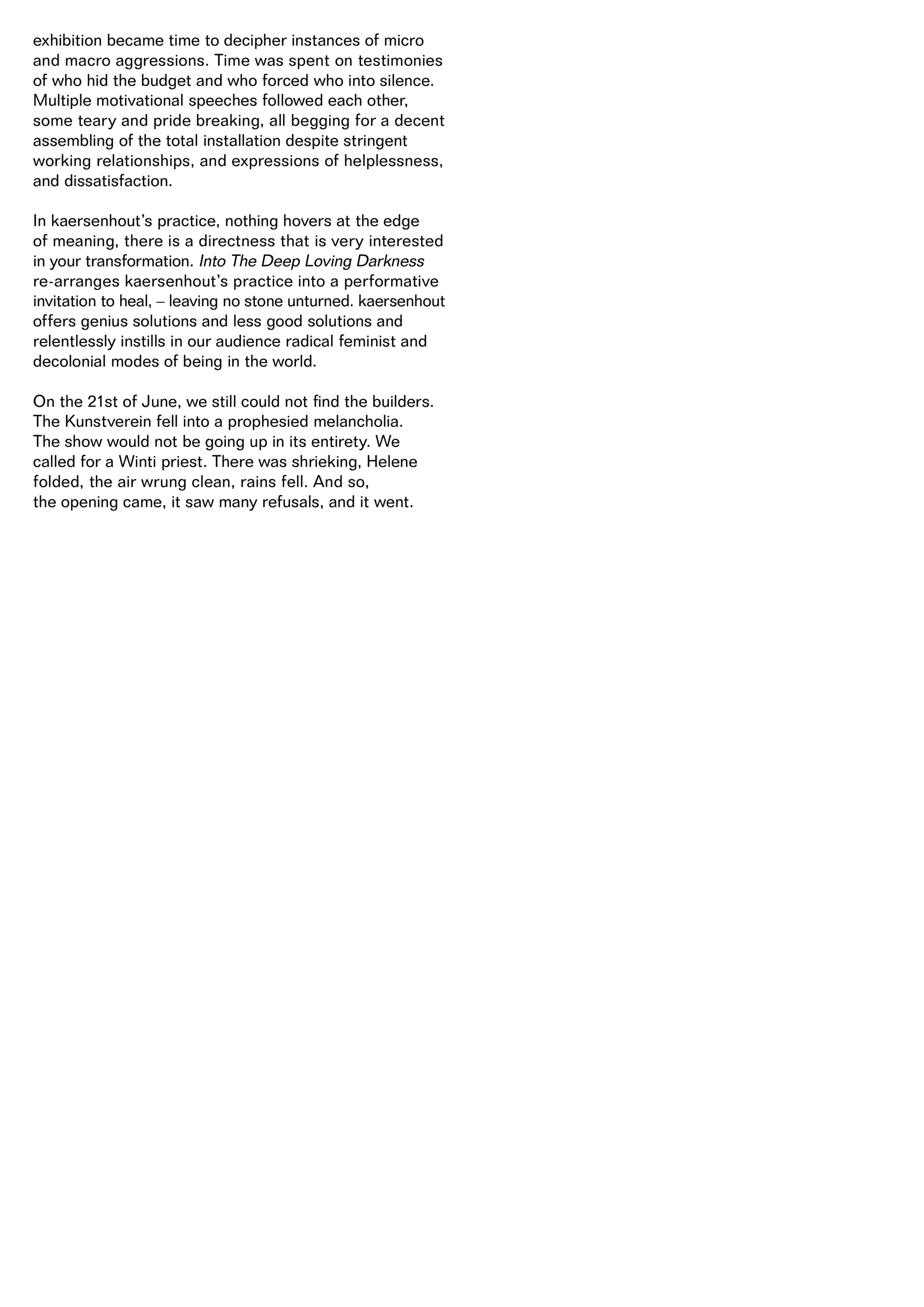 In kaersenhout’s practice, nothing hovers at the edge of meaning, there is a directness that is very interested in your transformation. Into The Deep Loving Darkness re-arranges kaersenhout’s practice into a performative invitation to heal, – leaving no stone unturned. kaersenhout offers genius solutions and less good solutions and relentlessly instills in our audience radical feminist and decolonial modes of being in the world.